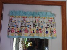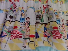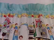 1950’s RETRO Kitchen Valances, Home Ec, Women Working In Aprons In Kitchen, Aqua