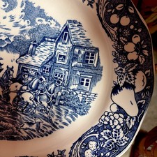 1970s VTG Sanyei HUGE Blue/White Oval Platter Cottage Carriage Coach Horse JAPAN