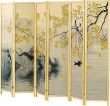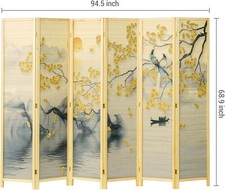 6 Panel Freestanding Beige Bamboo Room Divider, Folding Screen with Wood Frame