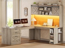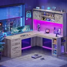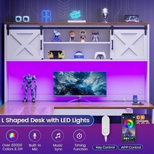 67″ Farmhouse L Shaped Desk w/Hutch&3 Drawers, Corner Computer Desk w/LED Lights