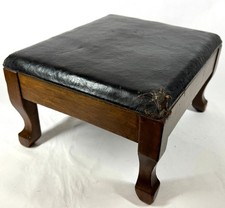 Antique 1920s Black Leather Top Rectangular 14″ X 12″ x 9″ Wood Footstool Stool