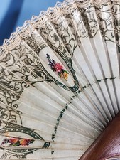 Antique Cuba Souvenir Wood Hand Held Painted Folding Fan With Mirror Cockade