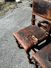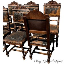 Antique Heavily carved victorian renaissance 6 castle chairs leather 1880