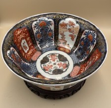 Antique Japan Hand Painted IMARI Signed Large Porcelain Bowl 11” Rosewood Stand