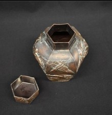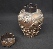 Antique Japanese Bronze Hexagonal Lidded Jar Crane & Wave Relief Meiji Era 6”