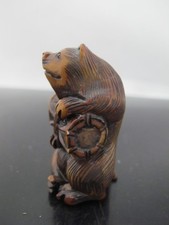 Antique JAPANESE Carved Wood BADGER or Bear with Barrel Netsuke Figurine