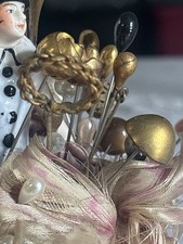 Be the first to review “Antique Porcelain Pierrot Clown Pincushion w/Hat Pins & Hair Work Ring Victorian”