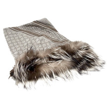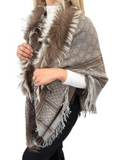 GUCCI Vintage GG Logo Monogram Fox Fur Shawl Scarf Wrap Gray Brown Wool
