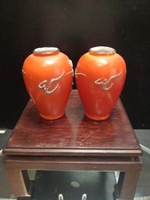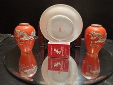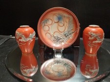 Japanese Moriage Dragonware Set In Orange 1x Plate 11.5 & 2 x Vases 8×5.5cmVGC