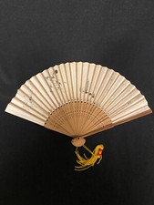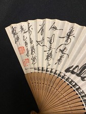 Japanese Paper Folding Fan Sensu Bamboo Frame Big Calligraphy Black on Beige