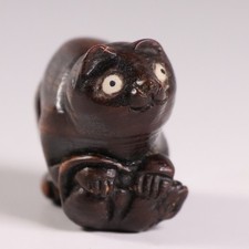 Japanese Wood Carving Cat & Rat Motif Netsuke 1.71inch Inro Ojime Meiji Era 19th