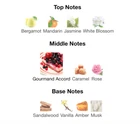 Bergamot, Jasmine, Rose, Vanilla, White Musk, caramel, Mandarin, Amber, Musk, Gourmand