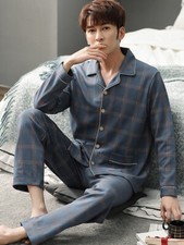 Men Check Pyjama Long Sleeve Top Trouser Cotton Nightwear Lounge Wear Pyjamas