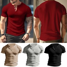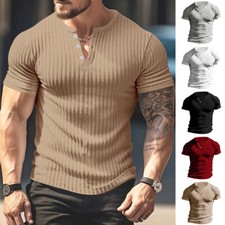 Mens Casual Short Sleeve Ribbed T-shirt Solid Color Slim Fit Stretch Muscle Top