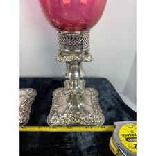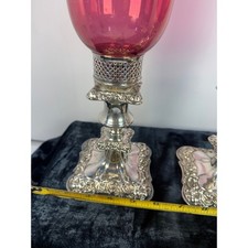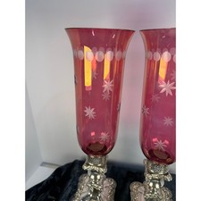 Be the first to review “Set of 2 Ruby Red Etched Glass Hurricane Candle Holders Ornate Silver Base”
