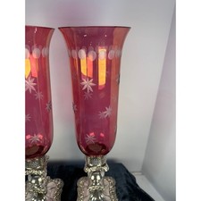Set of 2 Ruby Red Etched Glass Hurricane Candle Holders Ornate Silver Base