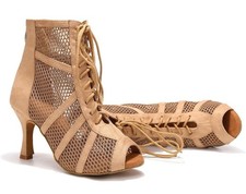 Sexy Tan Mesh Lace-Up Dance Heels | Latin Ballroom Peep Toe Shoes Size. 6.5 💃✨