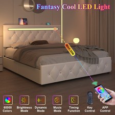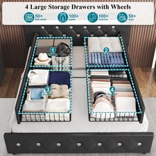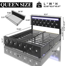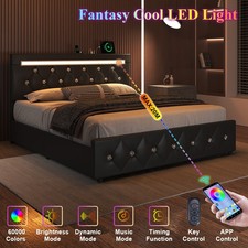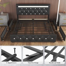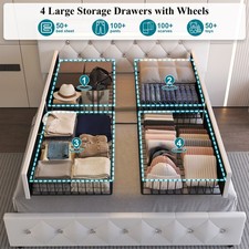 Upholstered Full Queen Bed Frame with Charging and LED Headboard, 4 Drawers