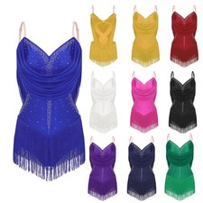 US Women’s Rhinestone Latin Dance Costume Ruched Mesh Tassel Jazz Dance Bodysuit