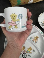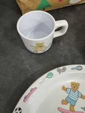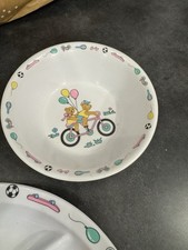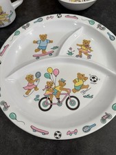 Vintage 90s Bear Bicycle Skateboard Soccer Melamine Divided Plate Bowl & Mug Set