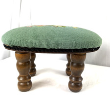 Vintage Cross Stitch Granny Foot Stool Farmhouse Wood Base Blue Needlepoint 14″