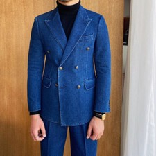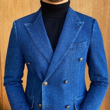 Vintage Denim Men’s Suit Wide Peak Lapel Wedding Formal Business Party Blazer
