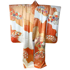 Vintage Japanese Furisode Kimono Silk Showa Era 1960s Fan Floral Pattern Orange