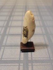 Vintage Scrimshaw Style Engraved Tooth with Bear Figure on Wood Stand