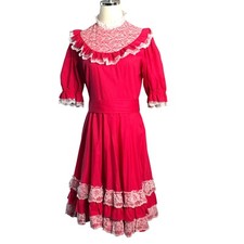 Vintage Square Dance Dress Small Raspberry Red Lace Yoke Hand Sewn Circle Skirt