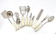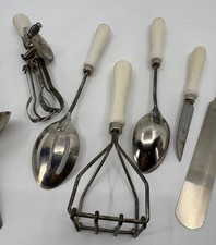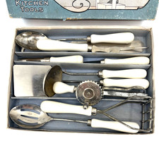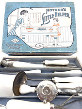 VTG 10 pc Antique Mother’s Little Helper A&J Kitchen Tools Utensils In Box