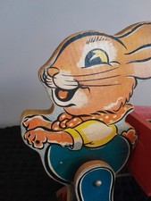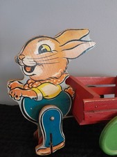 VTG. 1950s Wooden Bunny Rabbit &Cart Pull Toy Metal Bell Wheels N.N Hill Brass