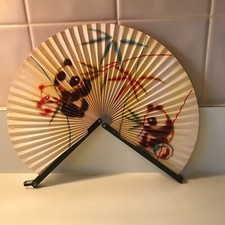 Vtg Chinese Paper Hand Fan PANDA Bamboo Metal Frame Clasp Pandas Gouache? Asian