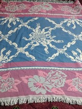 Vtg Throw Blanket Woven Tapestry Fringe Pink Blue Flower Bow 48″ x 54″ Cottage