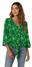 Women’s Button V Neck Chiffon Tops 3/4 Bell Sleeve Tie Knot Large Green Hat