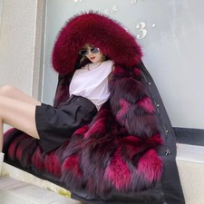 Womens Real Raccoon Fur Fox Fur Collar Lined Mid Long Coat Overcoat Parka Hooded