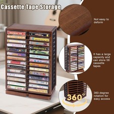 Wood cassette tape storage box 360 degree rotating rack holds 56 tapes