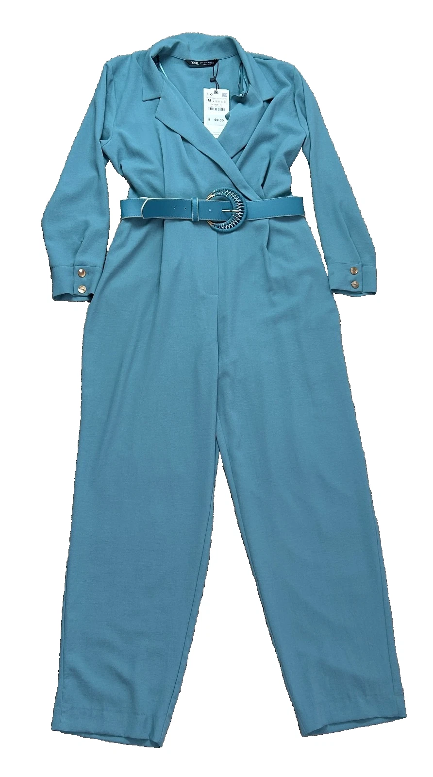 Zara Long Belted Jumpsuit with Belt Women’s Medium Turquoise Blue